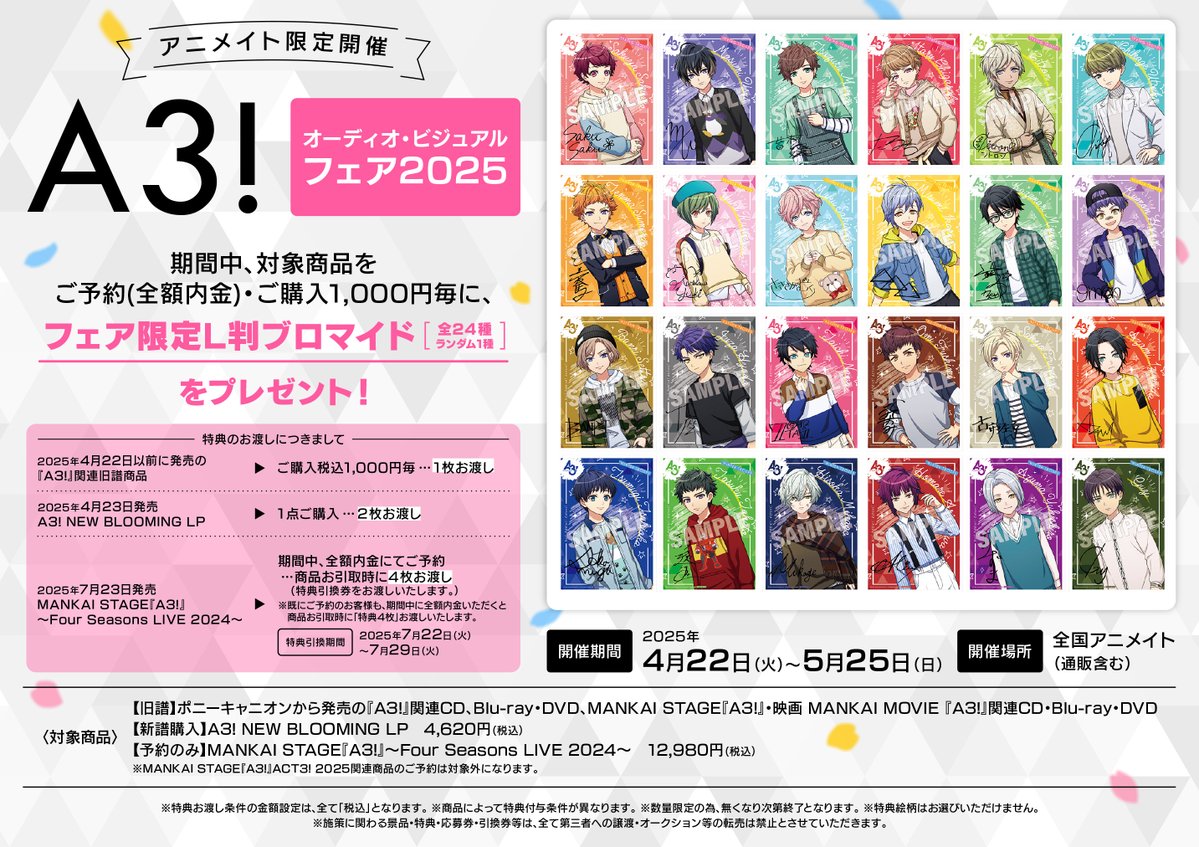 【フェア情報】 📣本日5/25(日)が最終日‼️‼️ A3! オーディオ・ビジュアルフェア2025 開催中コォ🎵🎵 期間中、対象CD/BD/DVD商品をご予約(全額内金)・ご購入1,000円毎に【フェア限定L判ブロマイド】をプレゼント✨✨ #エースリー