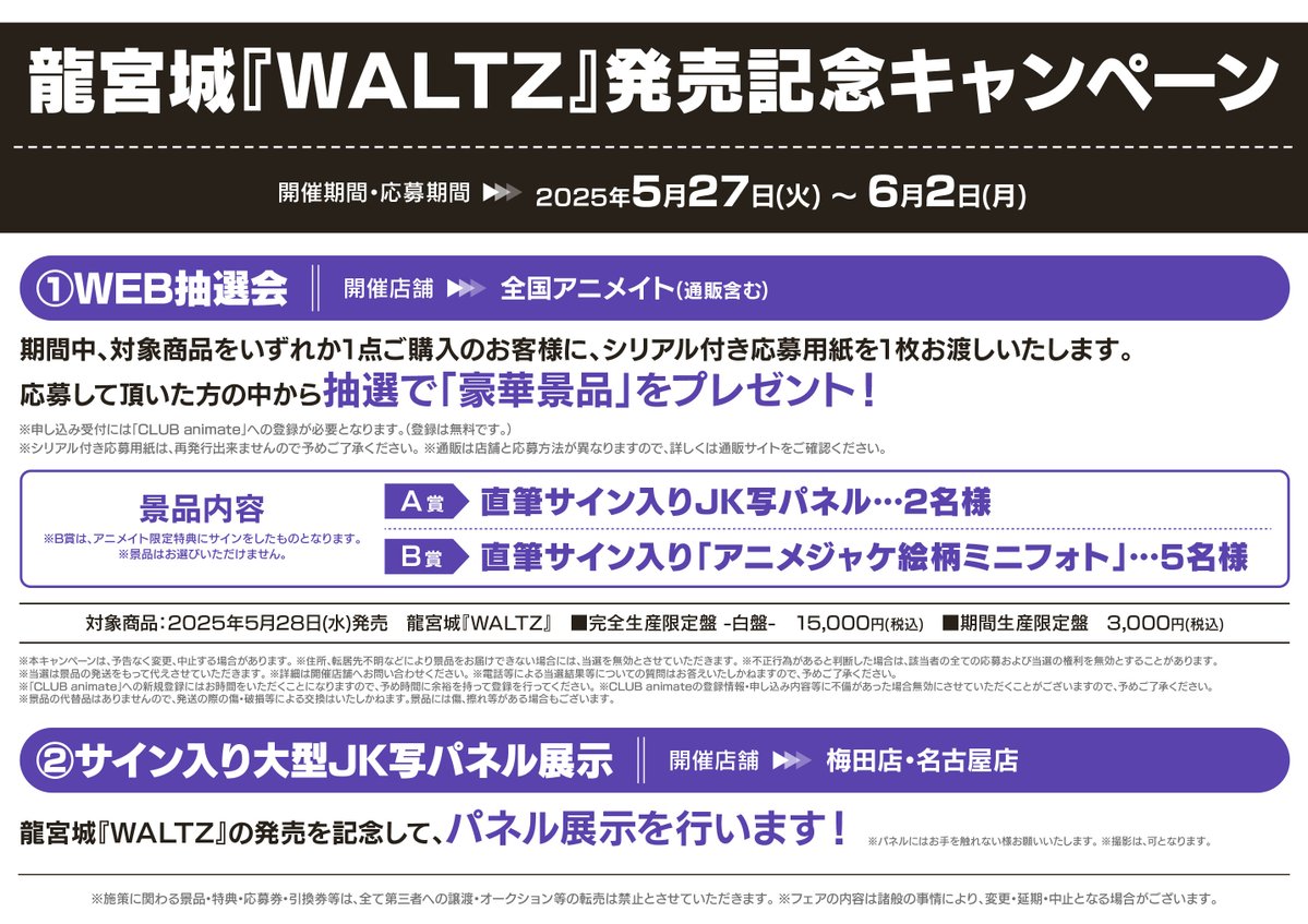 【フェア情報】 龍宮城『WALTZ』発売記念キャンペーン 5/27(火)から開催決定コォ‼️‼️ ①WEB抽選会 期間中、対象商品をいずれか1点ご購入のお客様に『シリアル付き応募用紙』をお渡しいたしますコォ✨✨ 詳細は🔽POPをチェック