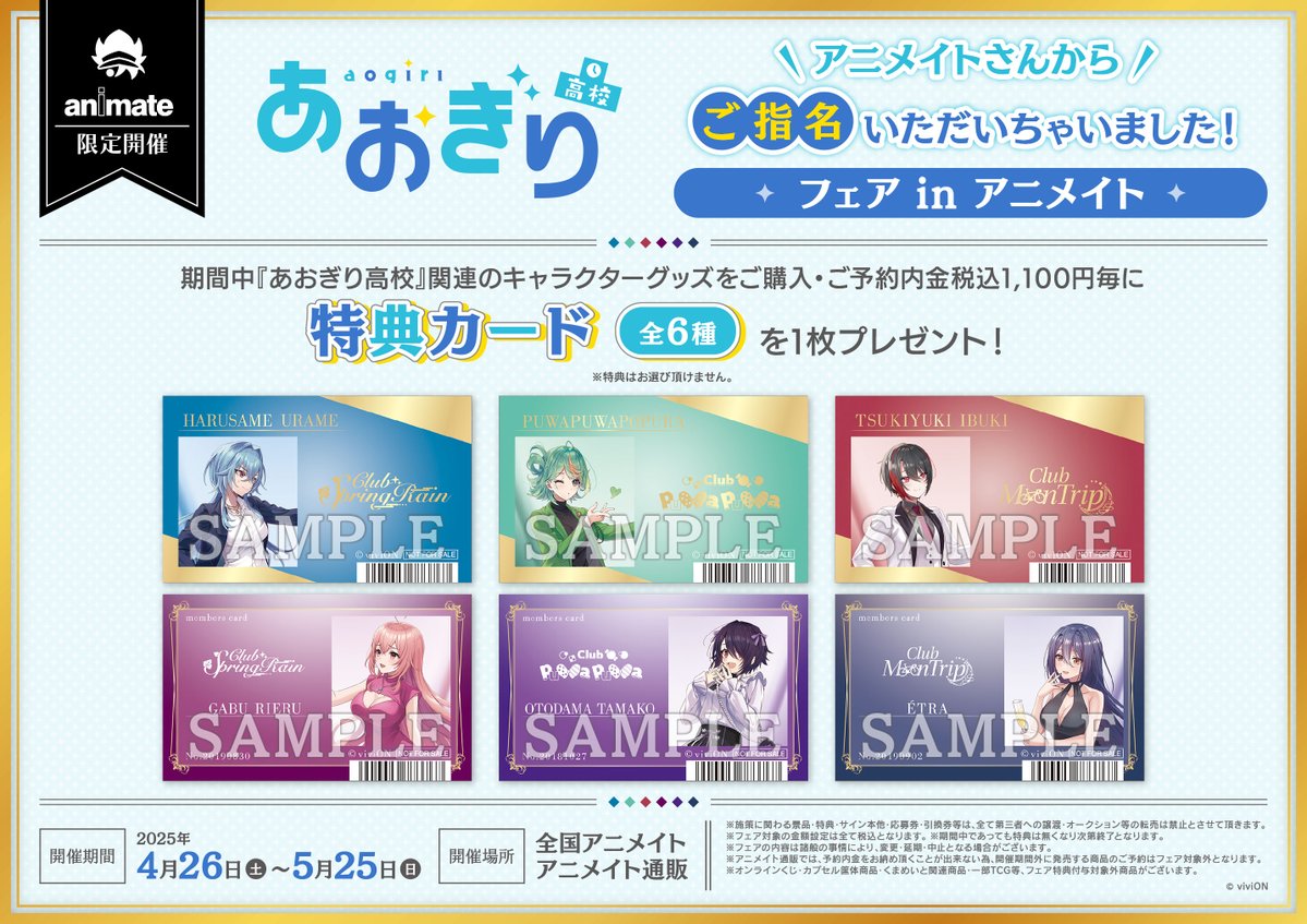 【フェア情報】 ‼フェアは5月25日まで‼ あおぎり高校 アニメイトさんからご指名いただいちゃいました! フェア in アニメイト まもなく終了ですコォ‼️ 期間中、フェア条件を満たしたお客様に、特典≪カード(全6種)≫をプレゼント🎁✨ 🔻詳細はこちら🔻 animate-onlineshop.jp/contents/fair_…