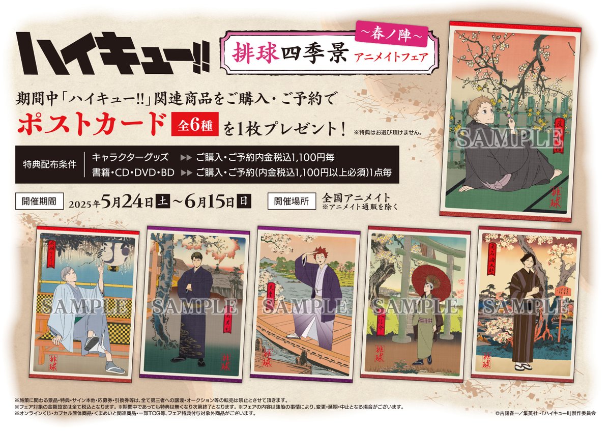 【フェア情報】 『ハイキュー!!』排球四季景〜春ノ陣〜アニメイトフェア明日5/24から開催! 対象商品をご購入・ご予約で【ポストカード(全6種)】をプレゼント! 詳細は添付画像をご確認ください。 #hq_anime #ハイキュー