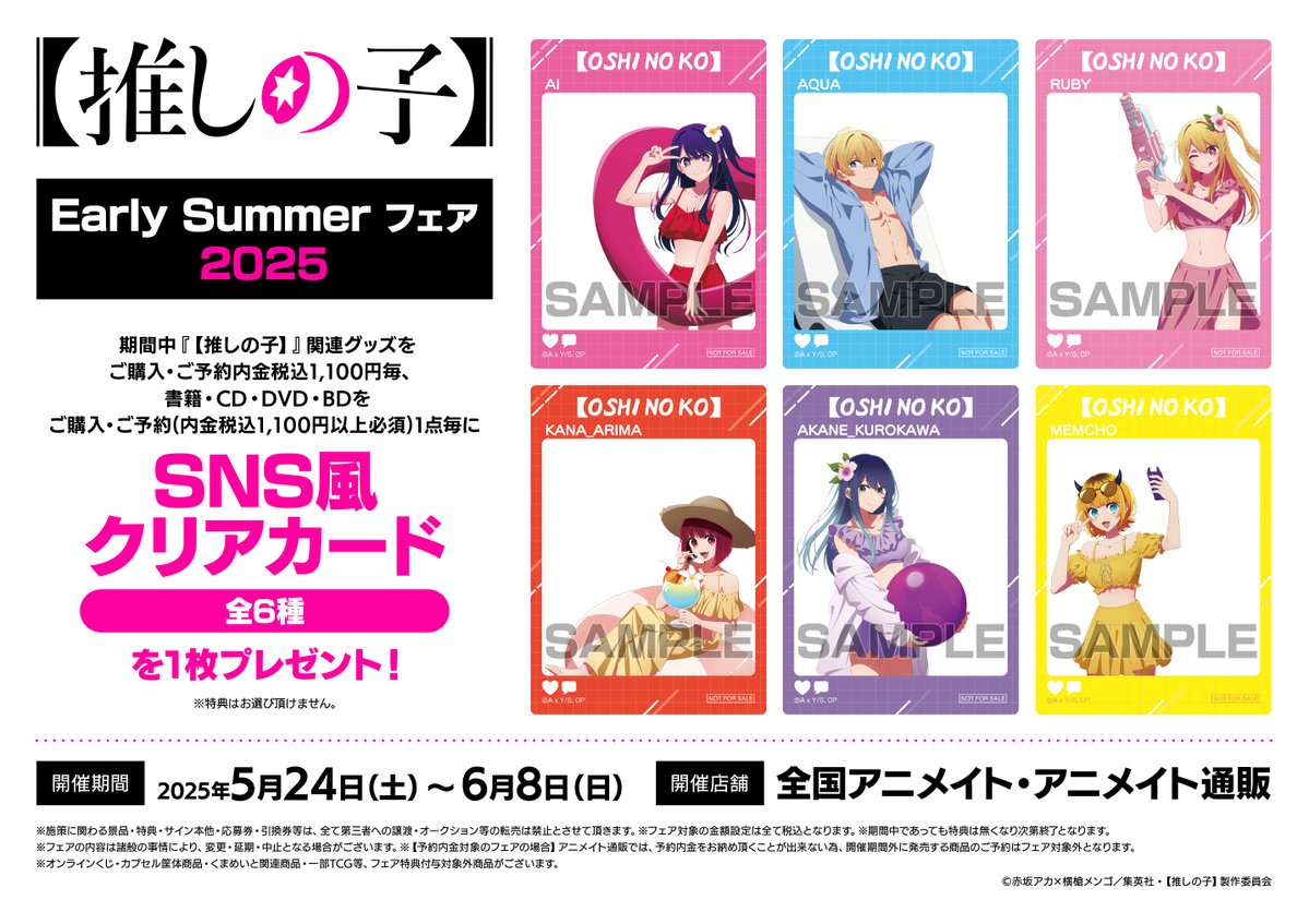 【フェア情報】 【推しの子】Early Summer フェア 2025 明日≪24日~≫開催ですコォ🎉 期間中、フェア条件を満たしたお客様に、≪SNS風クリアカード(全6種)≫を1枚プレゼント🎁✨ #推しの子 🔻詳細はこちら🔻 animate-onlineshop.jp/contents/fair_…