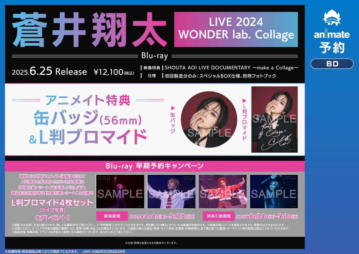 【フェア情報】 📣5/25(日)まで‼️‼️ 『蒼井翔太 LIVE 2024 WONDER lab. Collage』Blu-ray 早期予約キャンペーン 開催中コォ✨✨ 期間中、対象商品をご予約いただいたお客様に商品お引き取り時、【L判ブロマイド4枚セット(ライブ写真)】をプレゼントいたしますコォ‼️‼️ 詳細は🔽POPをチェック