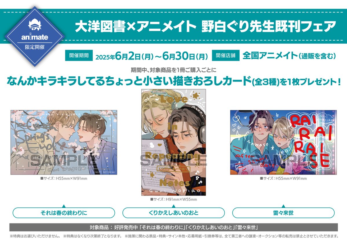【書籍フェア情報】 6/2(月)より‼️ 『大洋図書×アニメイト 野白ぐり先生既刊フェア』が開催決定コォ🎉 期間中、対象商品を1冊ご購入ごとに 【なんかキラキラしてるちょっと小さい描きおろしカード(全3種)】を1枚プレゼント🎁💕 #野白ぐり 先生 🔽詳しくはコチラ🔽