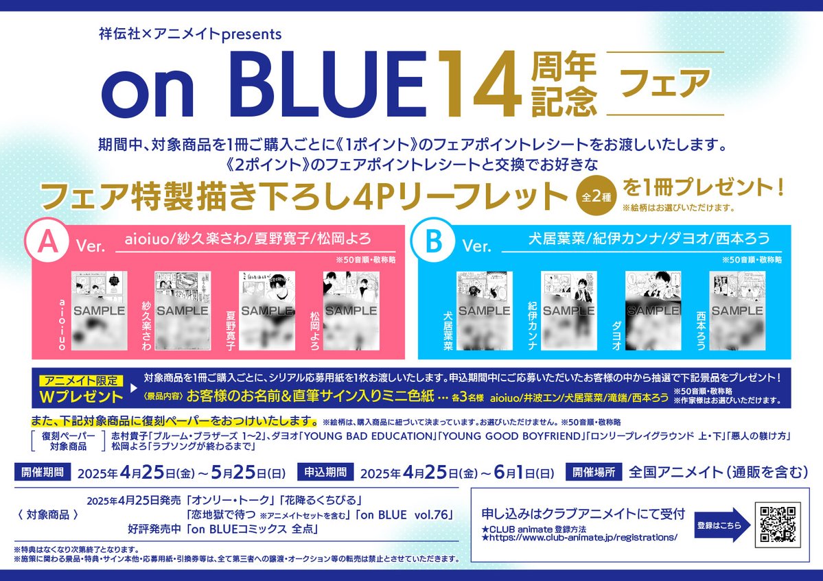 【書籍フェア情報】 まもなく終了‼️ 『祥伝社×アニメイトpresents on BLUE 14周年記念フェア』開催中コォ🎉 期間中、対象商品を2冊ご購入でお好きな 《フェア特製描き下ろし4Pリーフレット(全2種)》を1冊プレゼント🎁💕 🔽詳しくはコチラ🔽