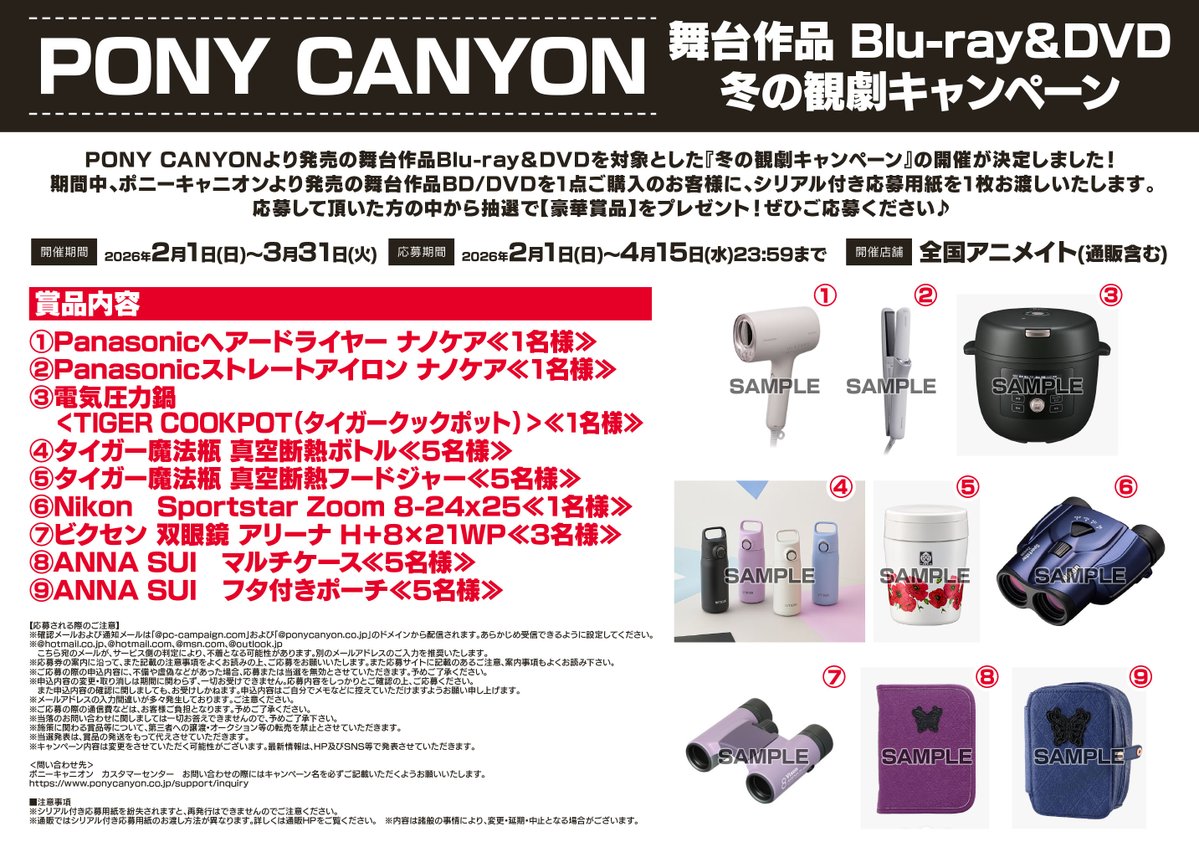 【キャンペーン情報】 2/1(日)より‼️ 『PONY CANYON 舞台作品 Blu-ray&DVD冬の観劇キャンペーン』開催コォ🎉 期間中対象商品1点ご購入のお客様に ≪シリアル付き応募用紙≫を1枚お渡し致します🎶 応募して頂いた方の中から抽選で≪豪華賞品≫をプレゼント💕 🔽詳しくはコチラ🔽