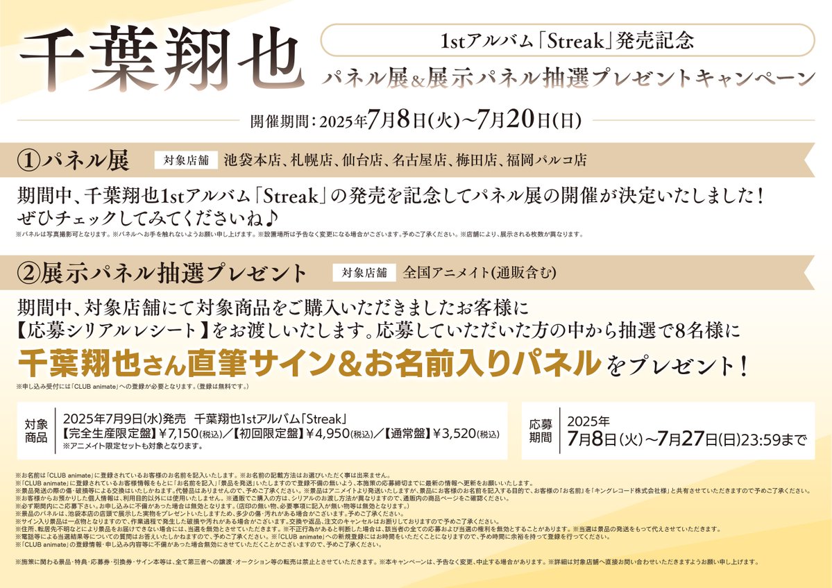 【フェア情報】 千葉翔也1stアルバム「Streak」発売記念パネル展&展示パネル抽選プレゼントキャンペーン 7/8(火)から開催決定コォ‼️‼️ 郡山店は②展示パネル抽選プレゼントが対象✨ 対象商品をご購入いただきましたお客様に応募シリアルレシートをお渡しいたしますコォ✨✨ 詳細は🔽POPをチェック