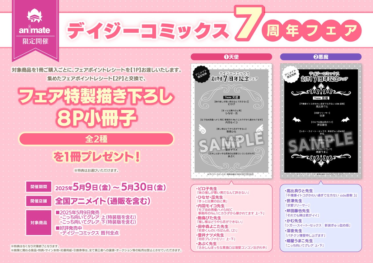 【書籍フェア情報】 本日より 『デイジーコミックス7周年フェア』 が開催ですコォ❣️ 期間中、対象商品2冊ご購入毎に【フェア特製描き下ろし8P小冊子(全2種)】を1点プレゼント🎁 🔽詳細は下記の画像をチェック🔽