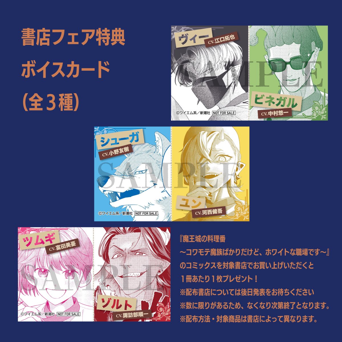 【書籍フェア情報】 『魔王城の料理番』4巻発売記念キャンペーン 期間中、#魔王城の料理番 コミックスを1冊購入で 録り下ろしキャラボイスが聴けるボイスカード(全3種)をお渡し致しますコォ✨ 🔽詳細は下記の画像をチェック🔽