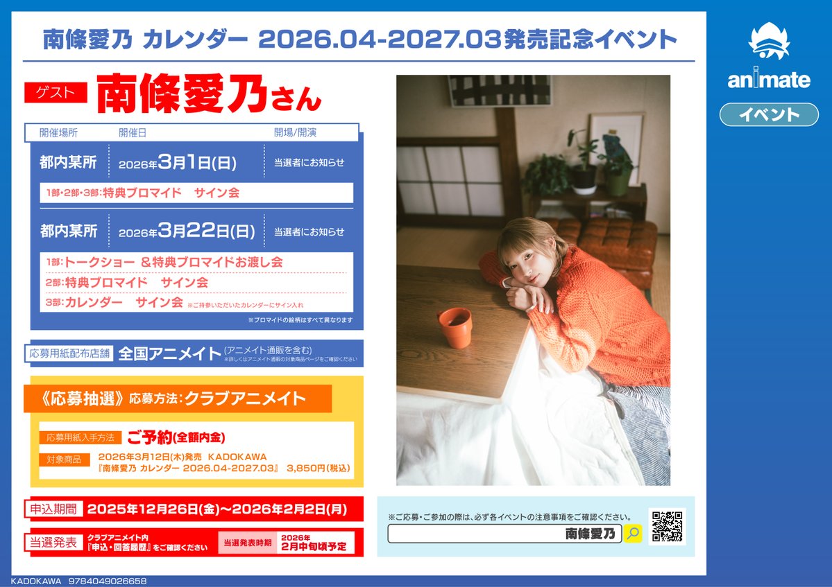【書籍イベント情報】 『南條愛乃 カレンダー 2026.04-2027.03発売記念イベント』 開催決定コォ🎶 対象商品をご予約(全額内金)いただいたお客様に、応募シリアルをお渡し🎁 #南條愛乃 さん 🔽詳細はコチラ🔽