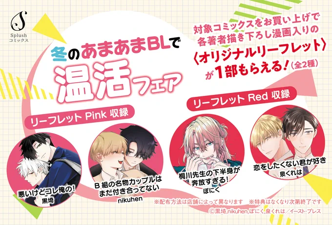 【書籍フェア開催】 ✨Splushコミックス 『冬のあまあまBLで温活フェア』✨ フェア対象商品を1冊お買い上げごとに、描き下ろし漫画が収録された【特製4Pリーフレット(全2種)】をプレゼント🎁 12/3~1/12 ※なくなり次第終了となります。