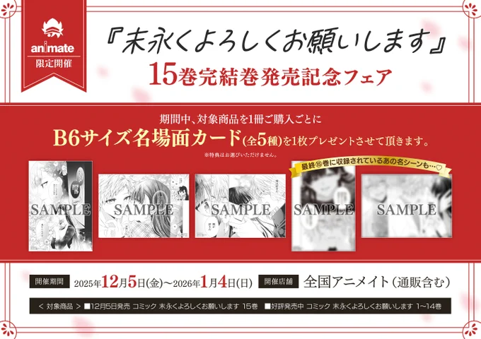 【書籍フェア情報】 現在、 『『末永くよろしくお願いします』15巻完結巻発売記念フェア』 が開催中ですコォ💕 期間中、対象商品1冊ご購入毎に【B6サイズ名場面カード(全5種)】を1枚プレゼント🎁 🔽詳細は下記の画像をチェック🔽