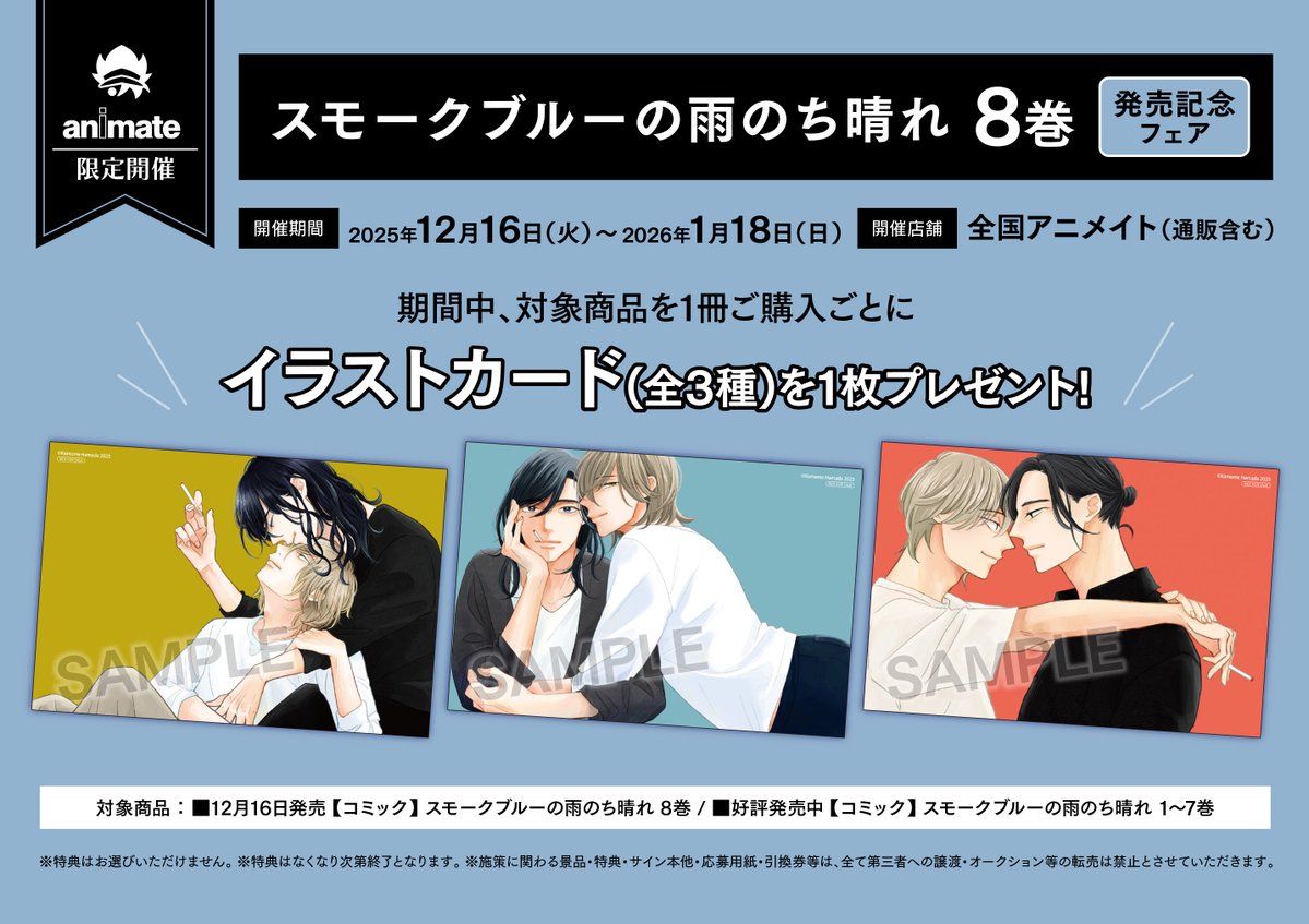 【書籍フェア情報】 12/16(火)より‼️ 「スモークブルーの雨のち晴れ」8巻発売記念フェアが開催決定しましたコォ🎉 対象商品を1冊ご購入ごとに 【イラストカード】を1枚プレゼント🎁 🔽詳しくはコチラ🔽