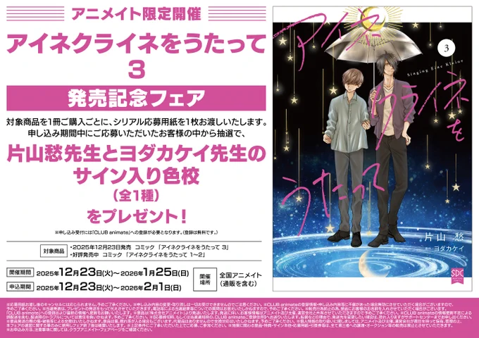 【書籍フェア情報】 『「アイネクライネをうたって 3」発売記念フェア』 本日より開催コォ🎵 期間中、対象商品を1冊ご購入ごとに【片山愁先生とヨダカケイ先生のサイン入り色校(全1種)】が当たるシリアル応募用紙を1枚お渡し🎁 🔽詳細はPOPをチェック🔽