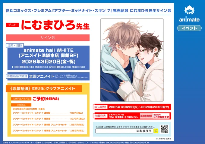 【書籍イベント情報】 「花丸コミックス・プレミアム『アフター・ミッドナイト・スキン 7』発売記念 にむまひろ先生サイン会」 開催決定コォ🌟 期間中、対象商品をご予約(内金全額)いただいたお客様に応募シリアルをお渡し🎵 #にむまひろ 先生 #アフター・ミッドナイト・スキン 🔽詳細はこちら🔽