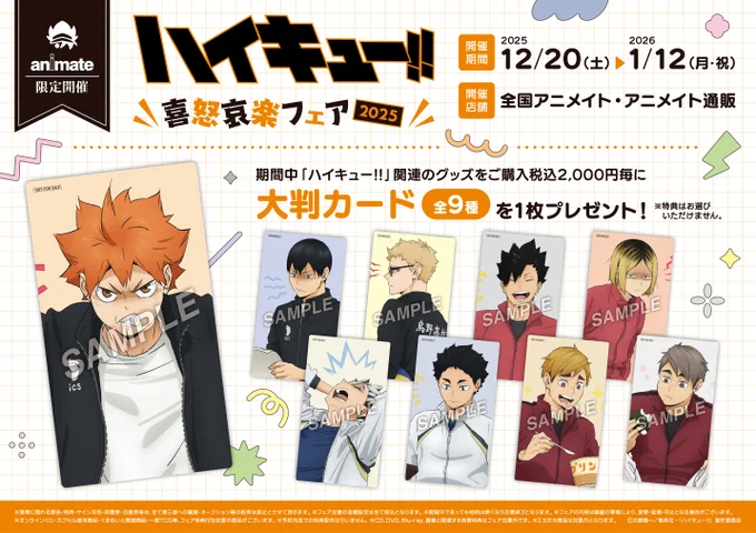 【「ハイキュー!!」喜怒哀楽フェア2025】が本日より開始! 期間中、関連商品をご購入で【大判カード(全9種)】を1枚プレゼント! 詳細はこちら #ハイキュー #hq animate-onlineshop.jp/conten…