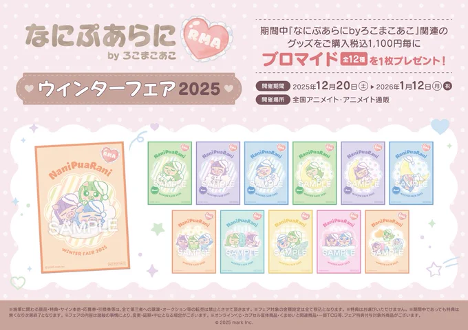 【フェア情報】 『なにぷあらにbyろこまこあこ』 ウィンターフェア2025 本日≪20日~≫開催ですコォ🎉 期間中、フェア条件を満たしたお客様に、≪ブロマイド(全12種)≫を1枚プレゼント🎁✨ 🔻詳細はこちら🔻 animate-onlineshop.jp/conten…