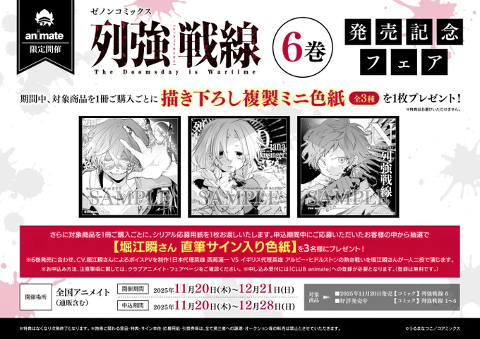 【書籍フェア情報】 現在開催中の 『ゼノンコミックス「列強戦線」6巻 発売記念フェア』 は12月21日まで‼️ 間もなく終了ですコォ‼️ 期間中、対象商品1冊ご購入毎に【描き下ろし複製ミニ色紙(全3種)】を1枚プレゼント🎁 #列強戦線 🔽詳細は下記の画像をチェック🔽