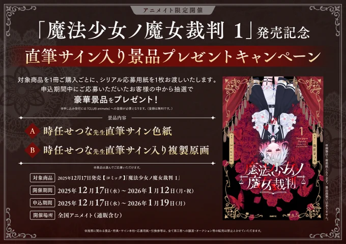 【書籍フェア情報】 『「魔法少女ノ魔女裁判 1巻」発売記念 時任せつな先生直筆サイン入り景品プレゼントキャンペーン』開催中コォ🎉 期間中対象商品を1冊ご購入ごとに《応募シリアル》を1枚お渡し🎁 抽選で時任せつな先生直筆【サイン色紙】や 【サイン入り複製原画】をプレゼント! #まのさば