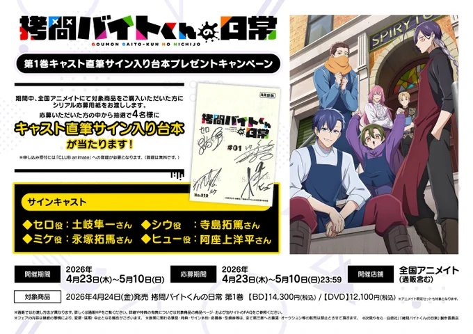 【フェア情報】 「拷問バイトくんの日常」第1巻キャスト直筆サイン入り台本プレゼントキャンペーン 4/23より開催決定コォ‼️‼️ 期間中、対象商品をご購入いただいた方にシリアル応募用紙をお渡しいたしますコォ✨✨ #拷問バイトくんの日常 詳細は🔽POPをチェック