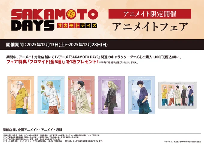 【フェア情報】 TVアニメ『SAKAMOTO DAYS』アニメイトフェア 明日≪13日~≫開催ですコォ🎉 期間中、フェア条件を満たしたお客様に、≪ブロマイド(全6種)≫を1枚プレゼント🎁✨ #サカモトデイズ #SAKAMOTODAYS 🔻詳細はこちら🔻 animate-onlineshop.jp/conten…