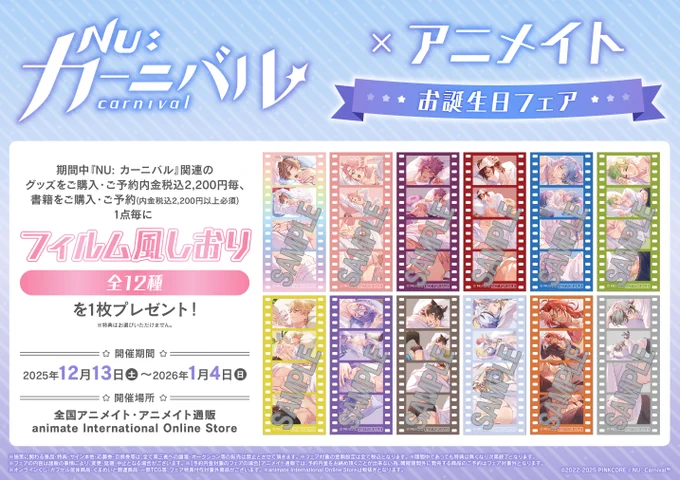 【フェア情報】 『NU: カーニバル』×アニメイト お誕生日フェア 明日≪13日~≫開催ですコォ🎉 期間中、フェア条件を満たしたお客様に、≪フィルム風しおり(全12種)≫を1枚プレゼント🎁✨ 🔻詳細はこちら🔻 animate-onlineshop.jp/conten…