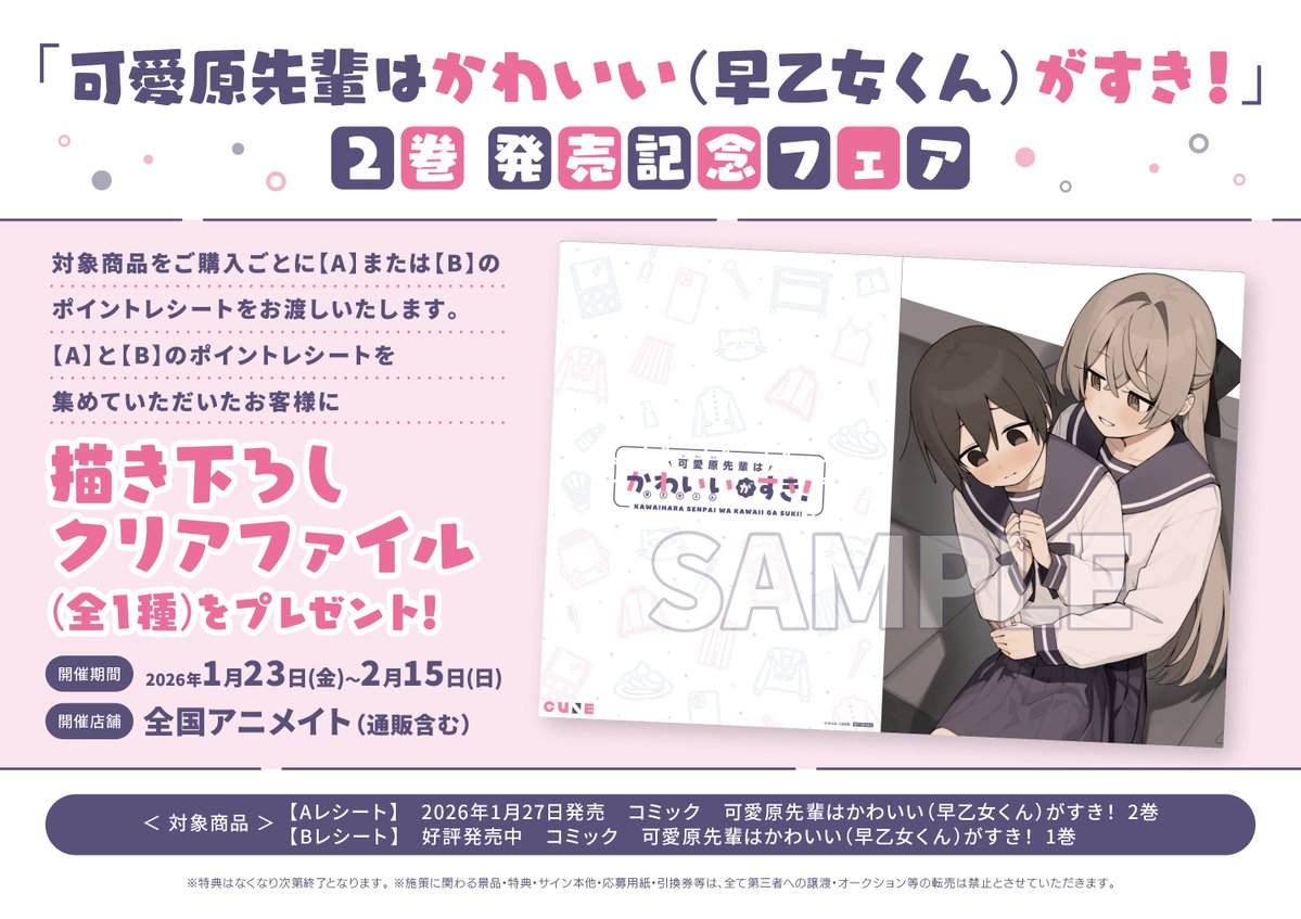 【書籍フェア情報】 本日より 『「可愛原先輩はかわいい(早乙女くん)がすき!」2巻 発売記念フェア』 が開催ですコォ💕 期間中、対象商品ご購入毎にお渡しのレシートを2種集めていただいた方に【クリアファイル(全1種)】をプレゼント🎁 #可愛原先輩はかわいいがすき 🔽詳細はコチラ🔽