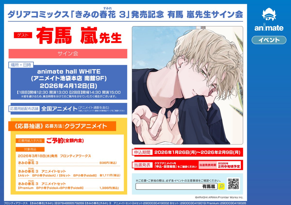 【書籍イベント情報】 『ダリアコミックス「きみの春花 3」発売記念 有馬 嵐先生サイン会』 の開催が決定ですコォ☀️ #きみの春花 #有馬嵐 先生 🔽詳細は下記の画像をチェック🔽