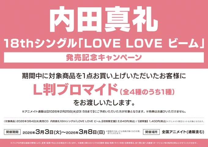 【フェア情報】 内田真礼18thシングル「LOVE LOVE ビーム」発売記念キャンペーン 3/3(火)より開催決定コォ‼️‼️ 期間中、対象商品を1点ご購入お買い上げいただいたお客様にL判ブロマイド(全4種のうち1種)をお渡しいたしますコォ✨✨ 詳細は🔽POPをチェック