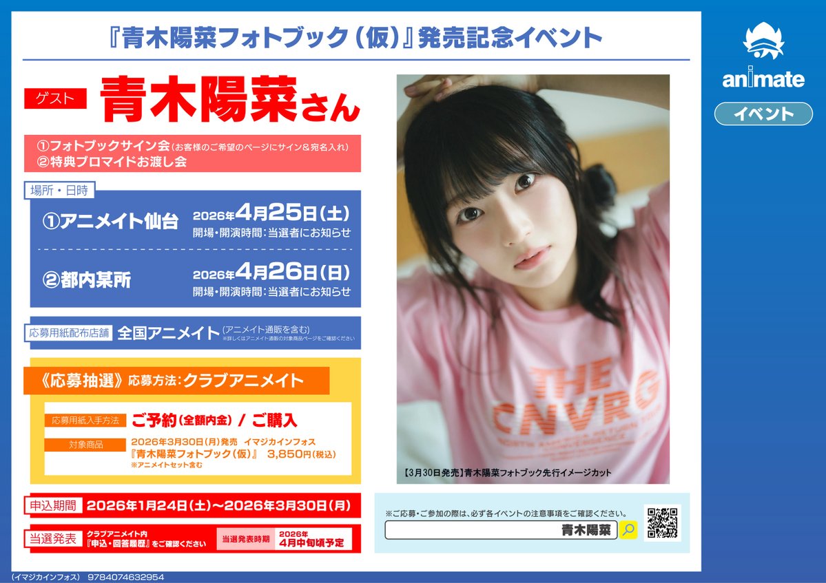 【書籍イベント情報】 「『青木陽菜 フォトブック(仮)』発売記念イベント」 開催決定コォ🎉 対象商品をご予約(全額内金)、もしくはご購入いただいたお客様に 【応募シリアル】をお渡しいたします🎁 #青木陽菜 さん 🔽詳しくはコチラ🔽