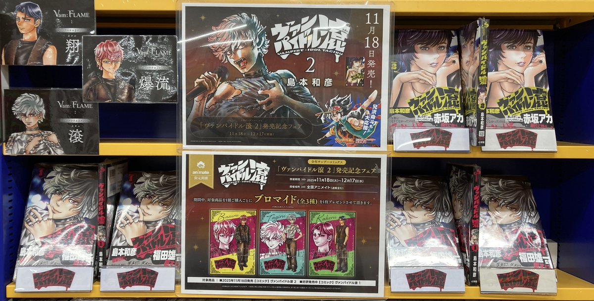 【書籍新刊情報】 「ヴァンパイドル滾」2巻が入荷しましたコォ‼️ さらに【少年サンデーコミックス「ヴァンパイドル滾 2」発売記念フェア】が本日より開催コォ💕 期間中、対象商品を1冊ご購入ごとに【ブロマイド(全3種)】を1枚プレゼント🎁 #ヴァンパイドル滾 #島本和彦 先生