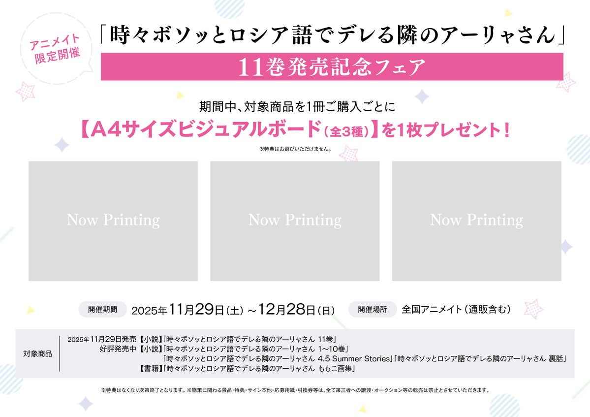 【書籍フェア情報】 11月29日より 『「時々ボソッとロシア語でデレる隣のアーリャさん」11巻発売記念フェア』 の開催が決定ですコォ💕 期間中、対象商品1冊ご購入毎に【A4サイズビジュアルボード(全3種)】を1枚プレゼント🎁 #ロシデレ 🔽詳細は下記の画像をチェック🔽