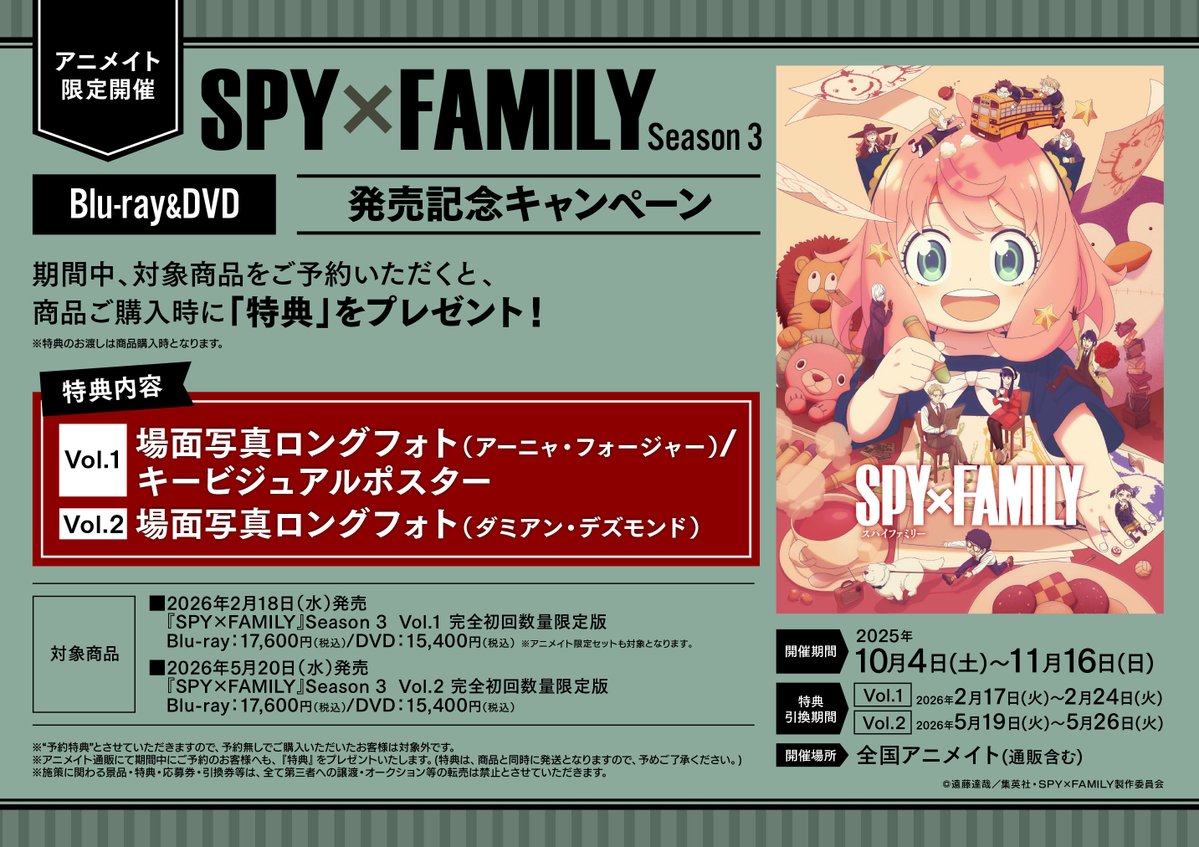 【BD/DVD予約情報】 TV 『SPY×FAMILY』Season 3 完全初回数量限定版 Vol.1・Vol.2 各巻予約受付中コォ✨✨ 発売記念キャンペーンは11/16(日)まで‼️‼️ 期間中にご予約で商品お引き取り時に特典をプレゼント✨✨ #SPY_FAMILY 🔽バーコード提示で簡単予約