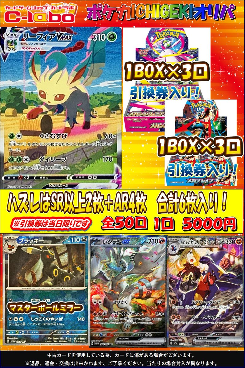 ポケカ5000円オリパ新しく展開致しました リーフィアVMAX🔥レシラムex🔥シロナのガブリアスex🔥 などなど 是非カードラボ郡山店までお越しください! 引換券は当日限り有効となります