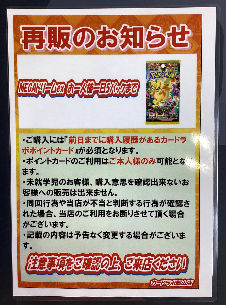 【ポケモンカード販売情報】 MEGAドリームex 入荷しました! ご購入の際前日までに購入履歴があるポイントカードが必須となっております。 皆様のご来店お待ちしております🙇♂️ ※お電話での在庫状況やお問い合わせはご遠慮ください。