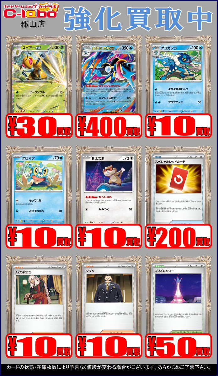 【ポケカ買取情報】 スピアーex【RR】{003/083} ¥30買取 メガゲッコウガex【RR】{022/083} ¥400買取 プリズムタワー【U】{080/083} ¥50買取 ニンジャスピナー買取募集中!!! たくさんのお持ち込みお待ちしております🙇♂️