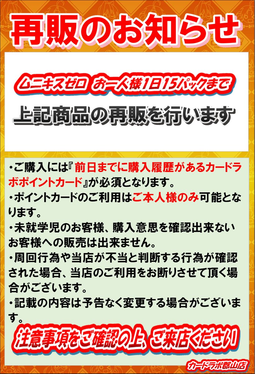 【ポケカ販売情報】 ポケモンカード 「ムニキスゼロ」 再販いたします。 お一人様1日15パックまでとなっております。 皆様のご来店お待ちしております。 ※前日までの購入履歴があるポイントカード必須となっております。 ※お電話でのお問い合わせはご遠慮ください。