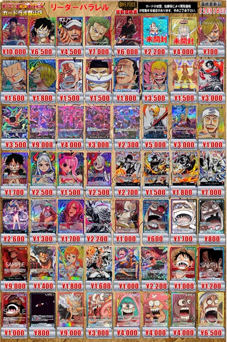 【ワンピースカード買取情報】 郡山店パラレル買取表です!! 1枚からのお持ち込み大歓迎です😊 買取受付は朝11時から💡 ぜひお持ち込みくださいませ🎶