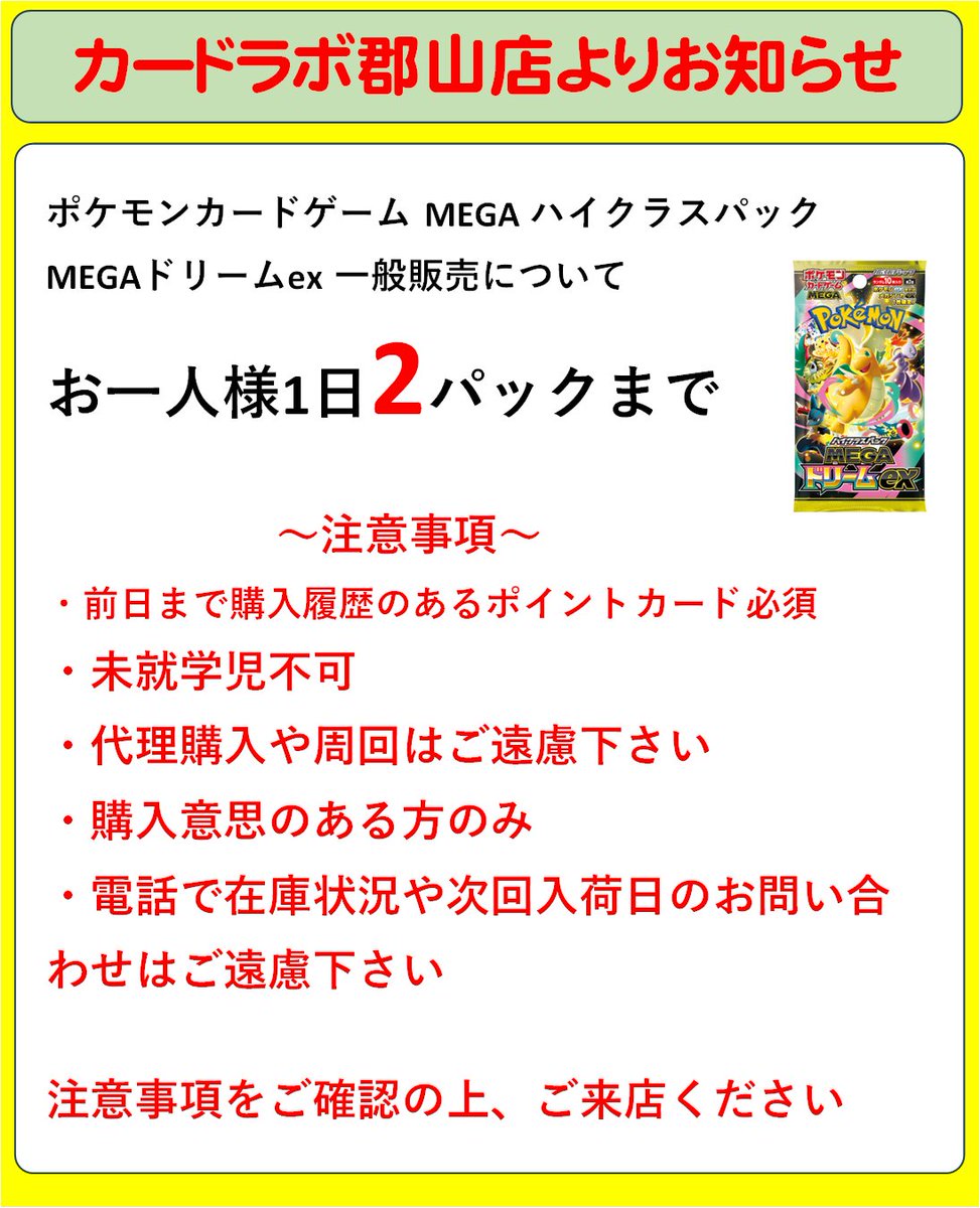 【販売情報】 ポケモンカードゲーム MEGA ハイクラスパック MEGAドリームex 数量限定で販売いたします。 購入条件を設けておりますので ご確認の上ご来店ください ・お一人様一日2パックまで ・前日まで購入履歴のあるポイントカード必須 ・代理購入や周回はご遠慮下さい
