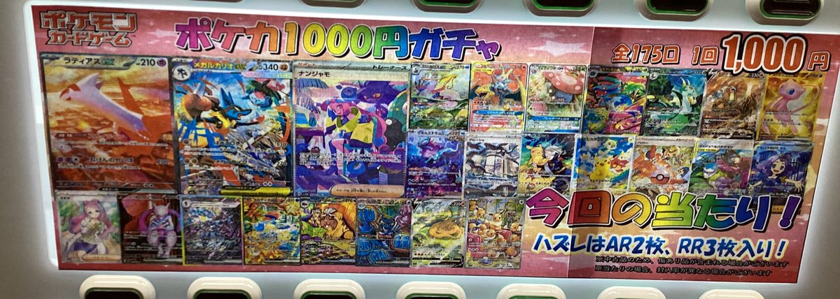 【ポケモンカード販売情報】 新しくポケカ1000円ガチャ展開しました✨️ 大当たりにラティアスexやメガルカリオ ナンジャモなど🥇 他は画像ラインナップが当たりとなっております🍀 運試しに1回いかがでしょうか? ご来店お待ちしております🙇♂️