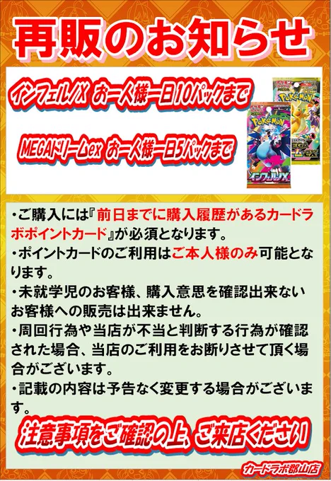 【ポケカ販売情報】 インフェルノX MEGAドリームex 入荷致しました 前日までに購入履歴があるポイントカードが必須となっております。 皆様のご来店お待ちしております。 ※お電話での在庫状況やお問い合わせはご遠慮ください。