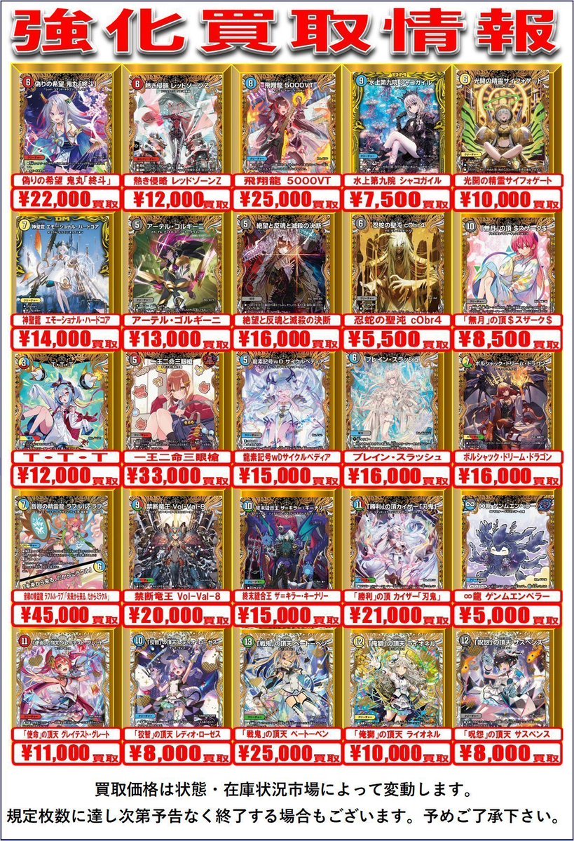 【デュエマ 買取情報】 一王二命三眼槍¥33,000 龍素記号wDサイクルペディア¥15,000 ブレイン・スラッシュ¥16,000 などなど金トレジャーの買取表になります 是非お持ち込みお待ちしております!