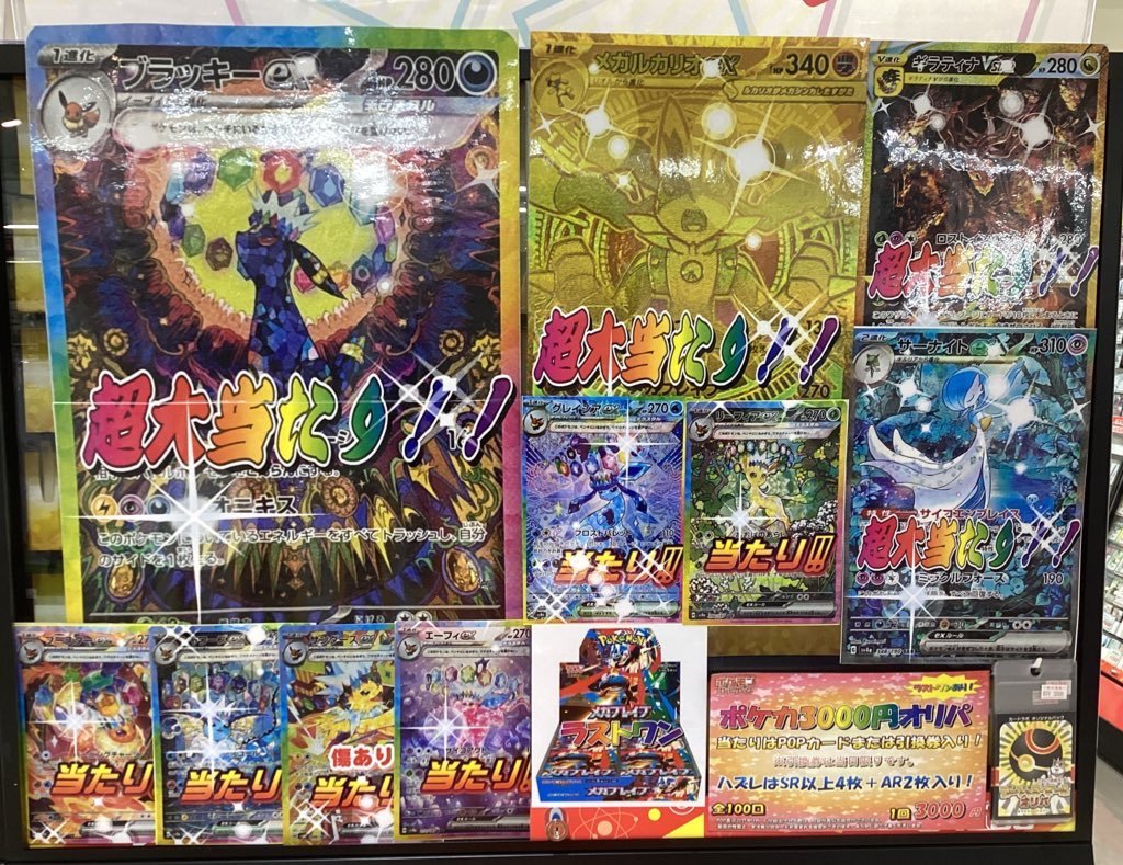 【ポケモンカード 販売情報】 ポケカ3000円オリパ展開中です♪ 大当たりは ブラッキーex SAR🌟メガルカリオex MUR🌟ギラティナVSTR などなど またラストワンもご用意しております╰(*´︶`*)╯ 是非カードラボ郡山店までお越し下さい♪