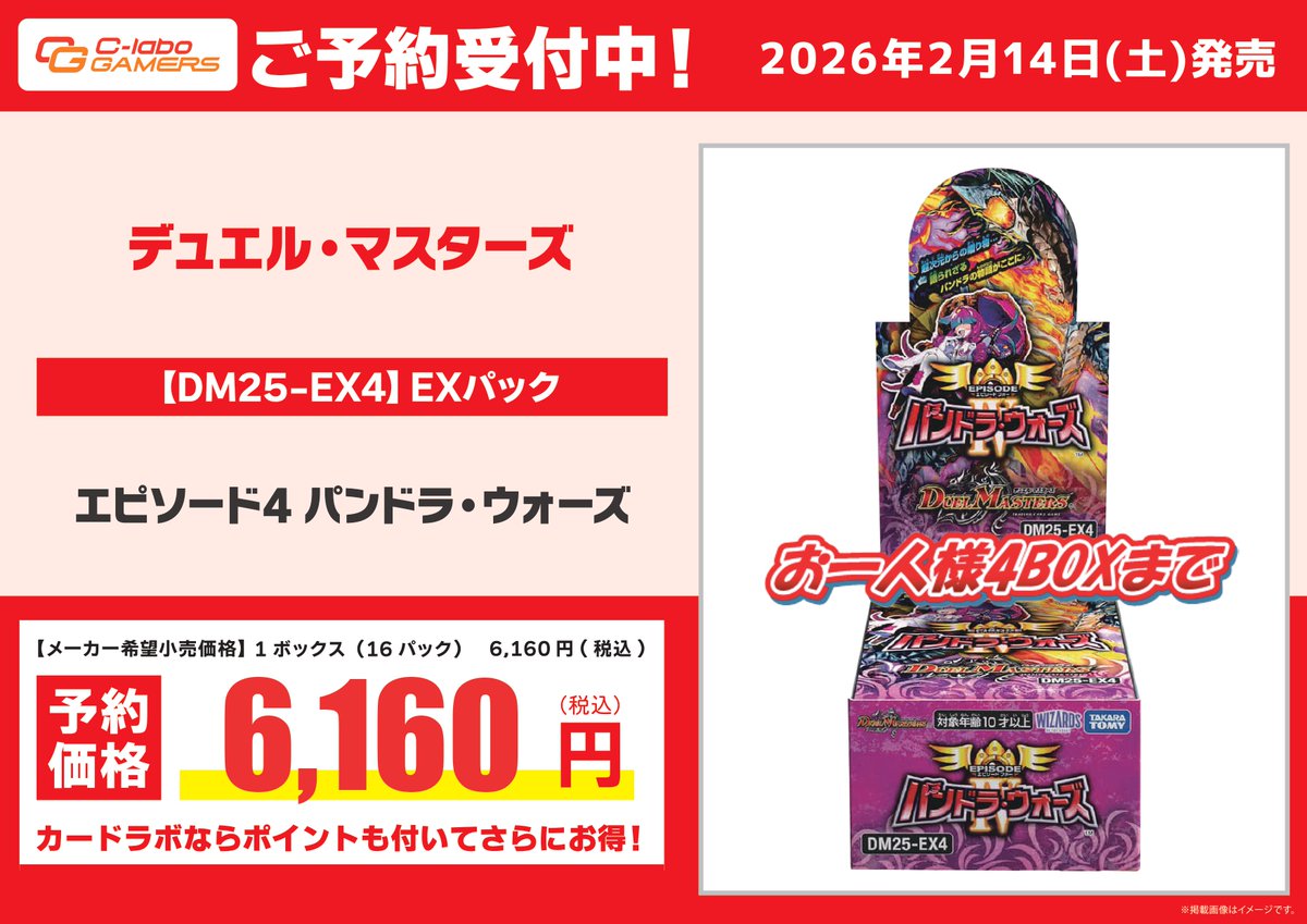 【デュエル・マスターズ 予約情報】 2月14日(土)発売‼️ [DM25‐EX4]EXパック 『エピソード4 パンドラ・ウォーズ』 ご予約受付開始致しました🔥🔥 お一人様4BOXまでとなります 是非カードラボ郡山店までお越しください!