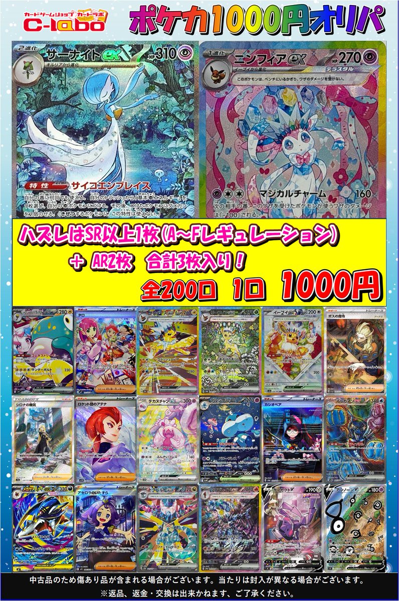 【ポケカ販売情報】 ポケカ1000円オリパ展開しました‼️ 今回の大当たりはサーナイトとニンフィア🎀 他にも画像ラインナップが当たりとなっております✨ 1口いかがでしょうか😊 皆様のご来店お待ちしております🙇♂️