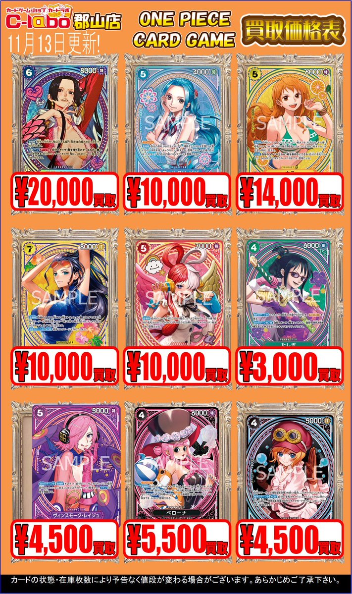 【ワンピースカード買取情報】 ヒロインSP&汎用カード買取表です! 在庫が足りておりません😢😢 カードラボ郡山店までぜひお持ち込みお願いします🙇♂️ パラレル定額も足りておりませんので 合わせてぜひお持ち込みください!