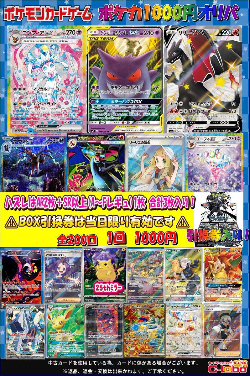 ポケカ1000円オリパ展開中🔥 大当たりは、ゲンガー&ミミッキュGX🎯リザードンV🎯ニンフィアex また、ブレックボルト1BOXやピカチュウARやキチキギスex SARなどもございます ぜひご来店お待ちしております🔥 引換券がでた際はお近くのスタッフまでお声掛けください