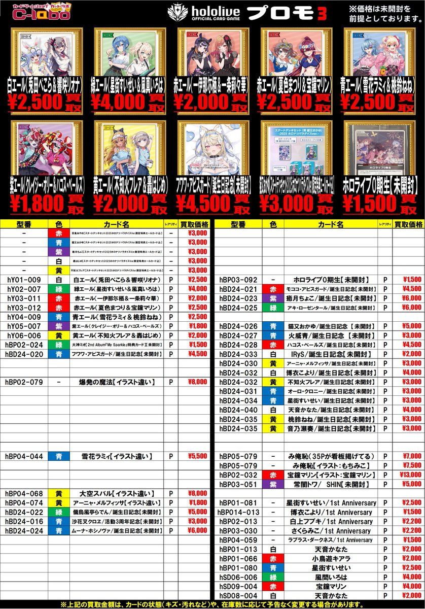 【ホロカ 買取情報】 ✨本日更新✨ 白エール(兎田ぺこら&響咲リオナ)P¥2,500 緑エール(星街すいせい&風真いろは)P¥4,000 赤エール(一伊那尓栖&一条莉々華)P¥2,000 などなど 是非お持ち込みお待ちしております❣❣