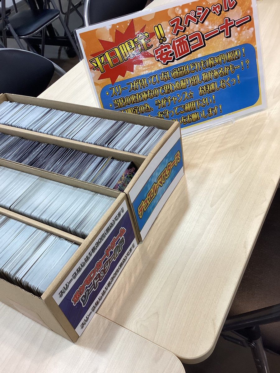 平日限定スペシャル安価コーナー設置いたしました♪ スリーブがついていないカードは1枚30円となっております🔥 ポケモンカード デュエル・マスターズ 遊戯王OCG ご用意しておりますのでごゆっくりお楽しみください