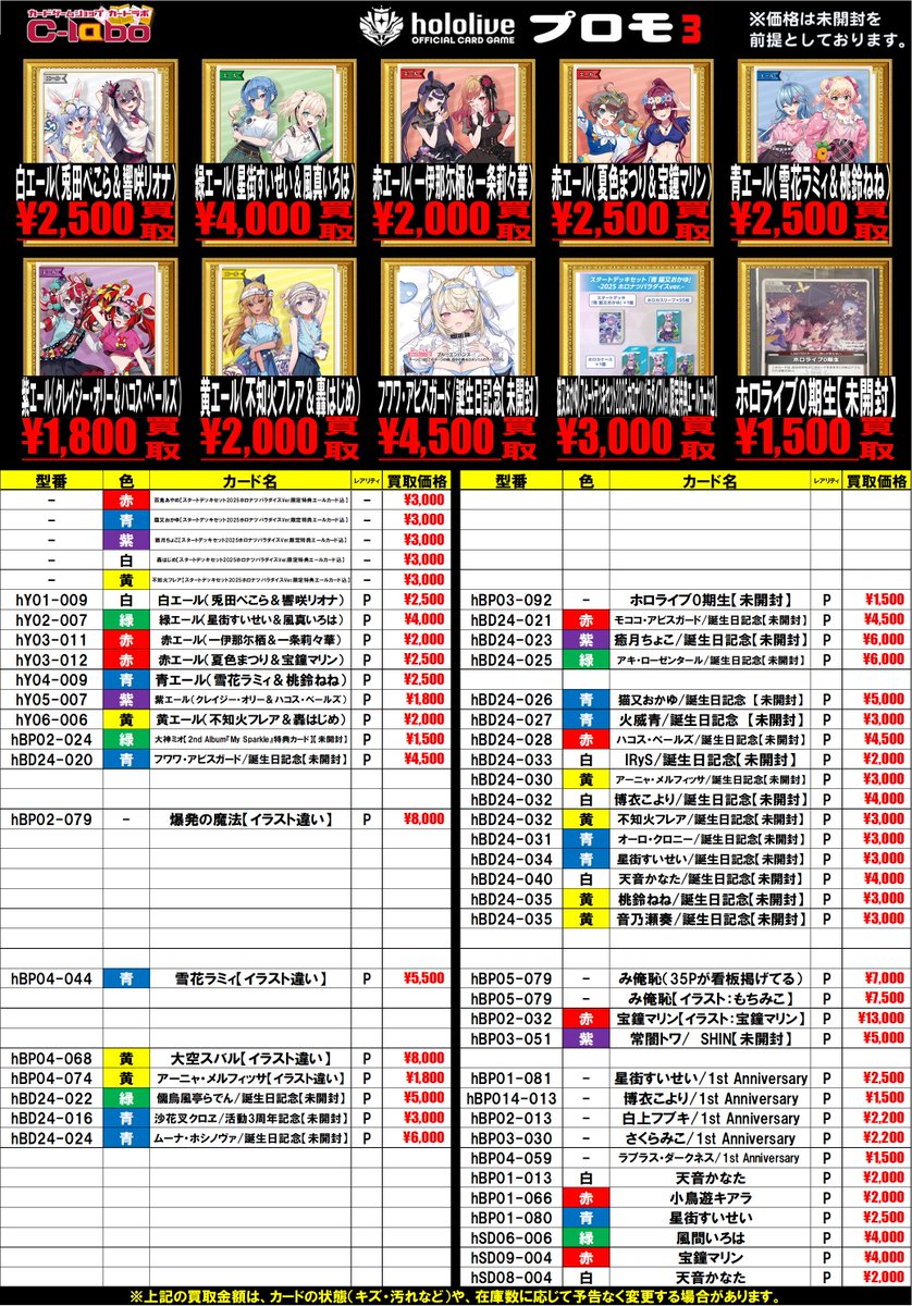 【ホロカ 買取情報】 ✨️本日更新✨️ 白エール(兎田ぺこら&響咲リオナ)P¥2,500 緑エール(星街すいせい&風真いろは)P¥4,000 赤エール(一伊那尓栖&一条莉々華)P¥2,000 などなど 是非お持ち込みお待ちしております❣❣