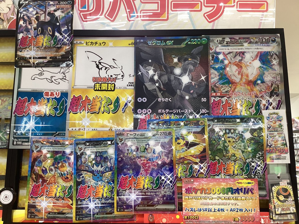 【ポケモンカード 販売情報】 3000円オリパ展開中✨ リザードンex SAR🎯ゼクロムex BWR🎯ピカチュウ ナガバ🎯ブラッキー ナガバ🎯 などなど またラストワンにテラスタルフェス1ボックスご用意しております🌟 ダミーをお持ちの上レジまでお越し下さい♪